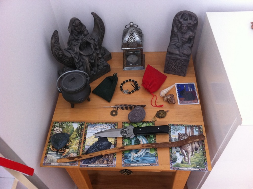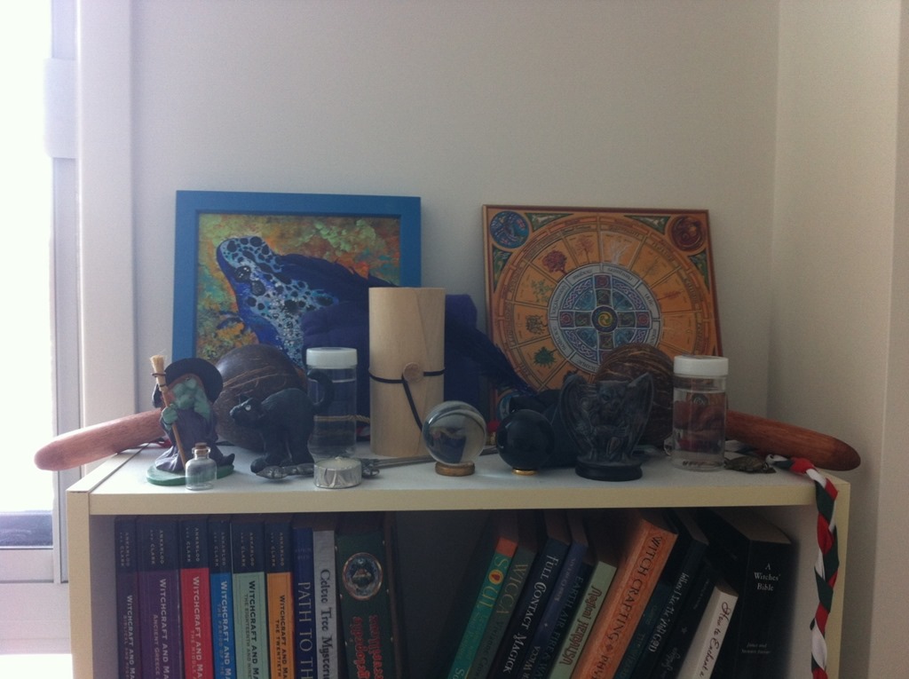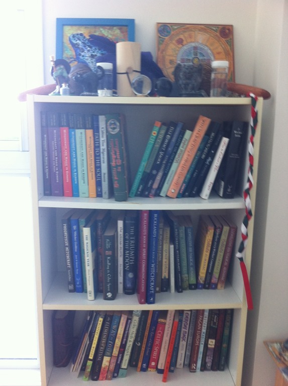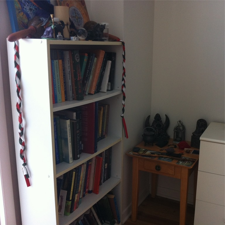 I’ve finished arranging my altar in my new place so I took pictures.  I have now a little corner when I can put pagan stuff on the wall.  I have a few but I don’t have the nails necessary to place them on the wall.  I also have my bookshelf where I keep my books on Paganism, Wicca and various subjects.  I plan to replace it by a taller bookshelf at some point, because I’d like to put there too my books on tarot as well.